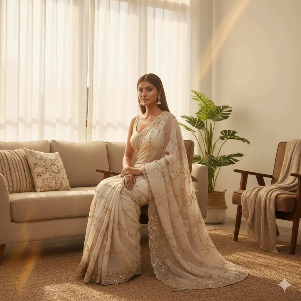 | Saree | Pure Space Silk in Velvet Shine Adorned with Sequence and Cutdana Delicate Handwork |