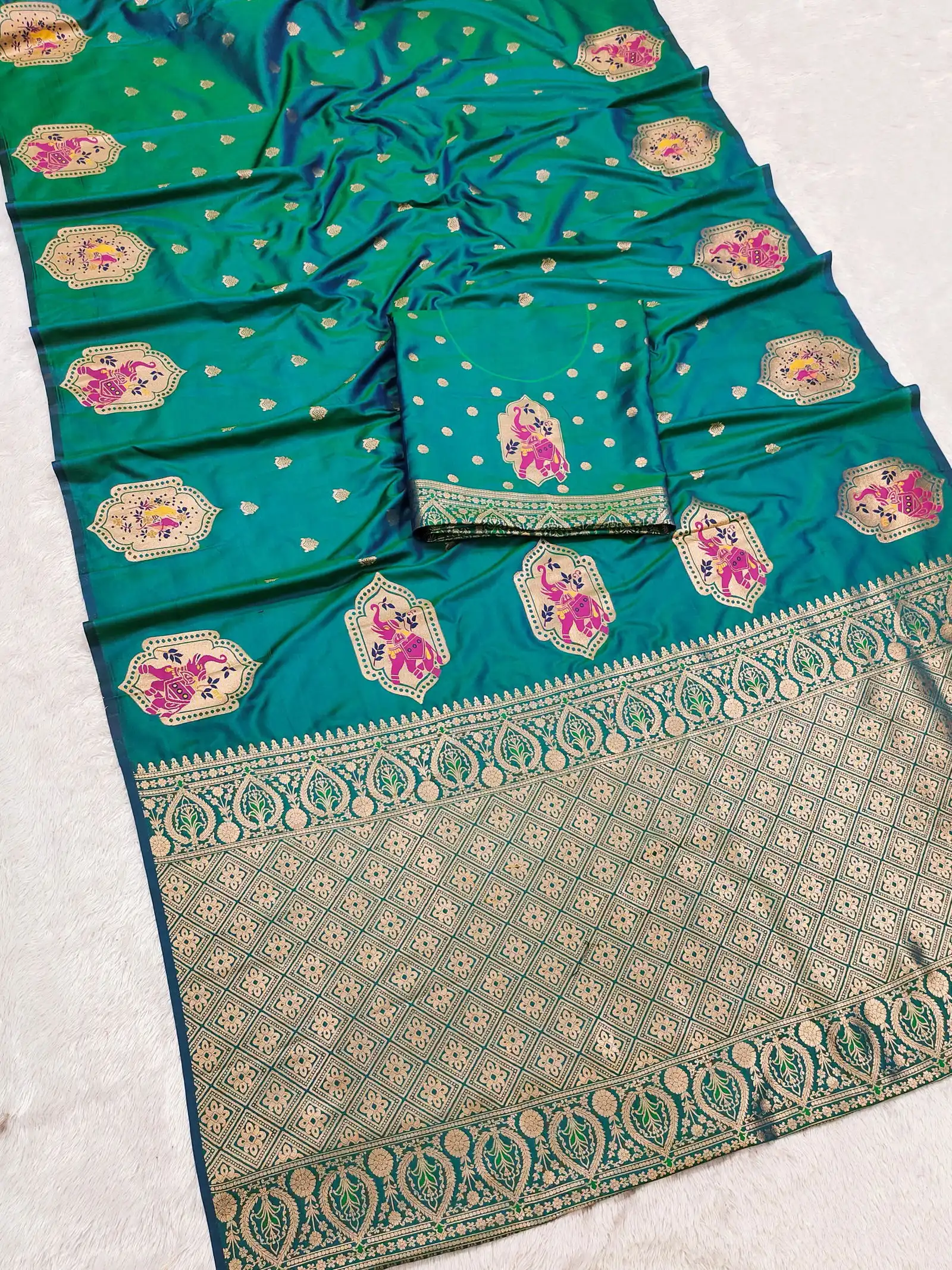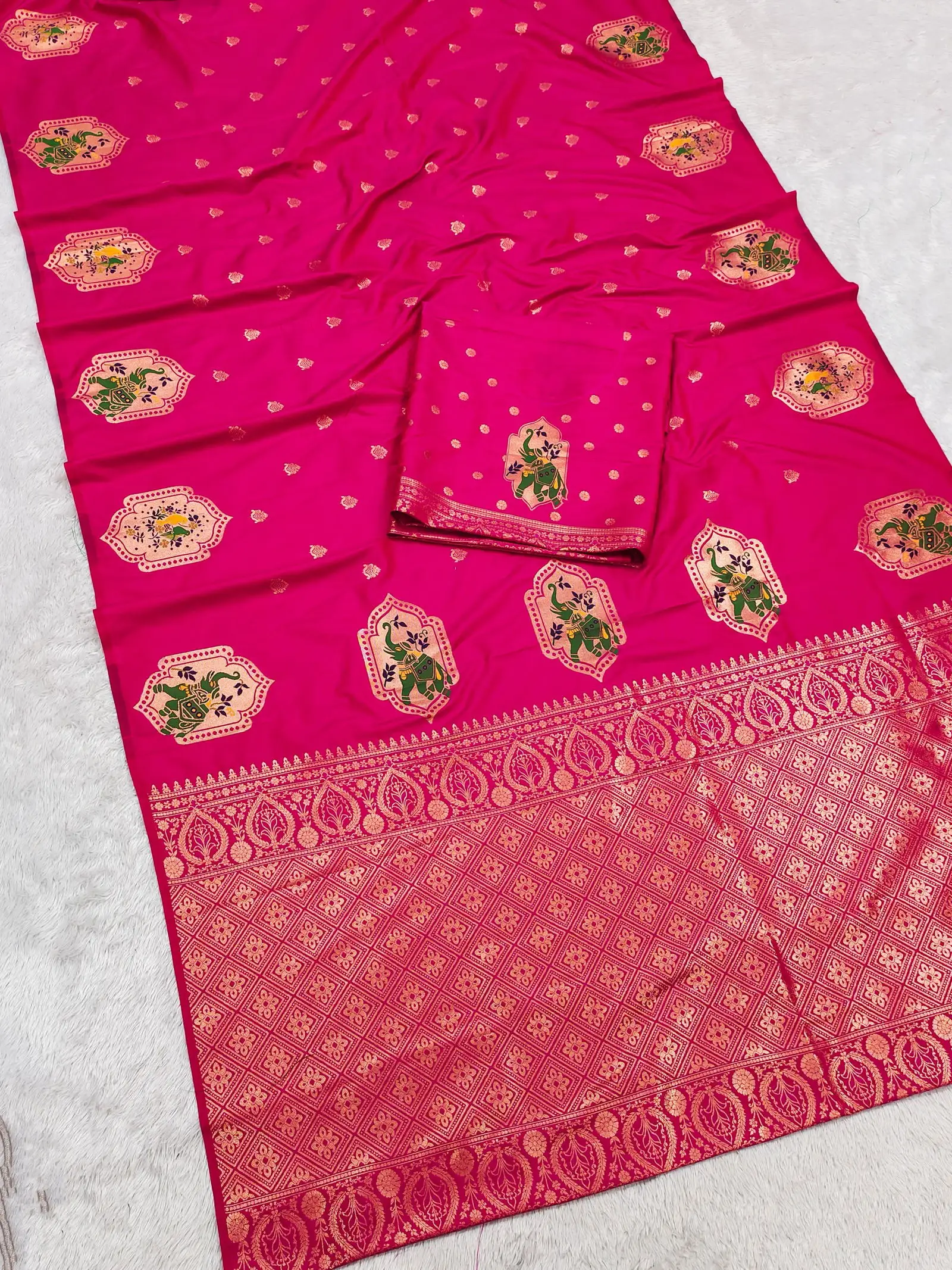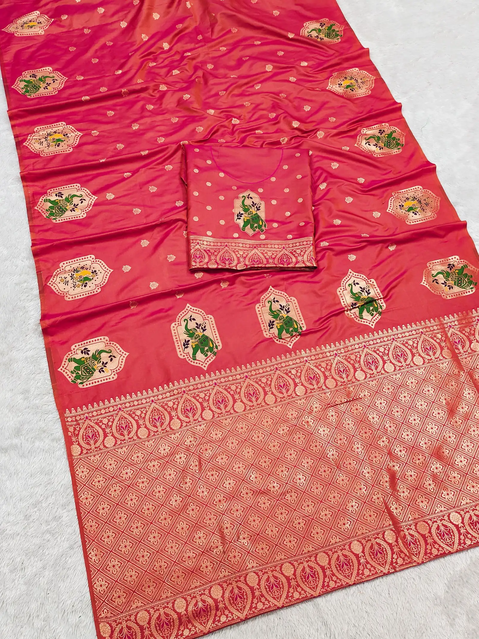 | Saree | Premium Banarasi Silk with All Over Small Zari Butta Weaving and Multicolored Meenakari Accents and Heavy Zari Woven Pallu |
