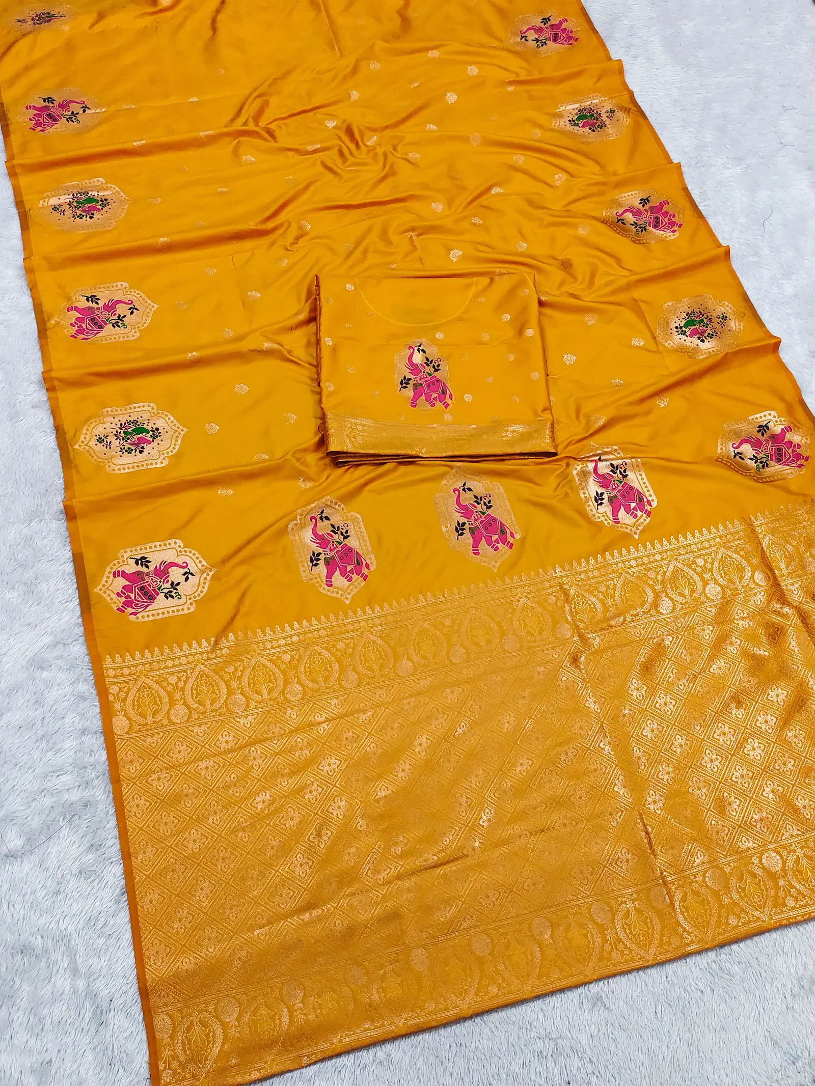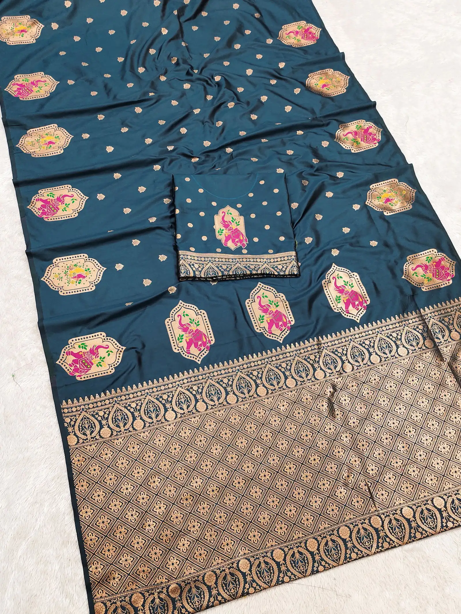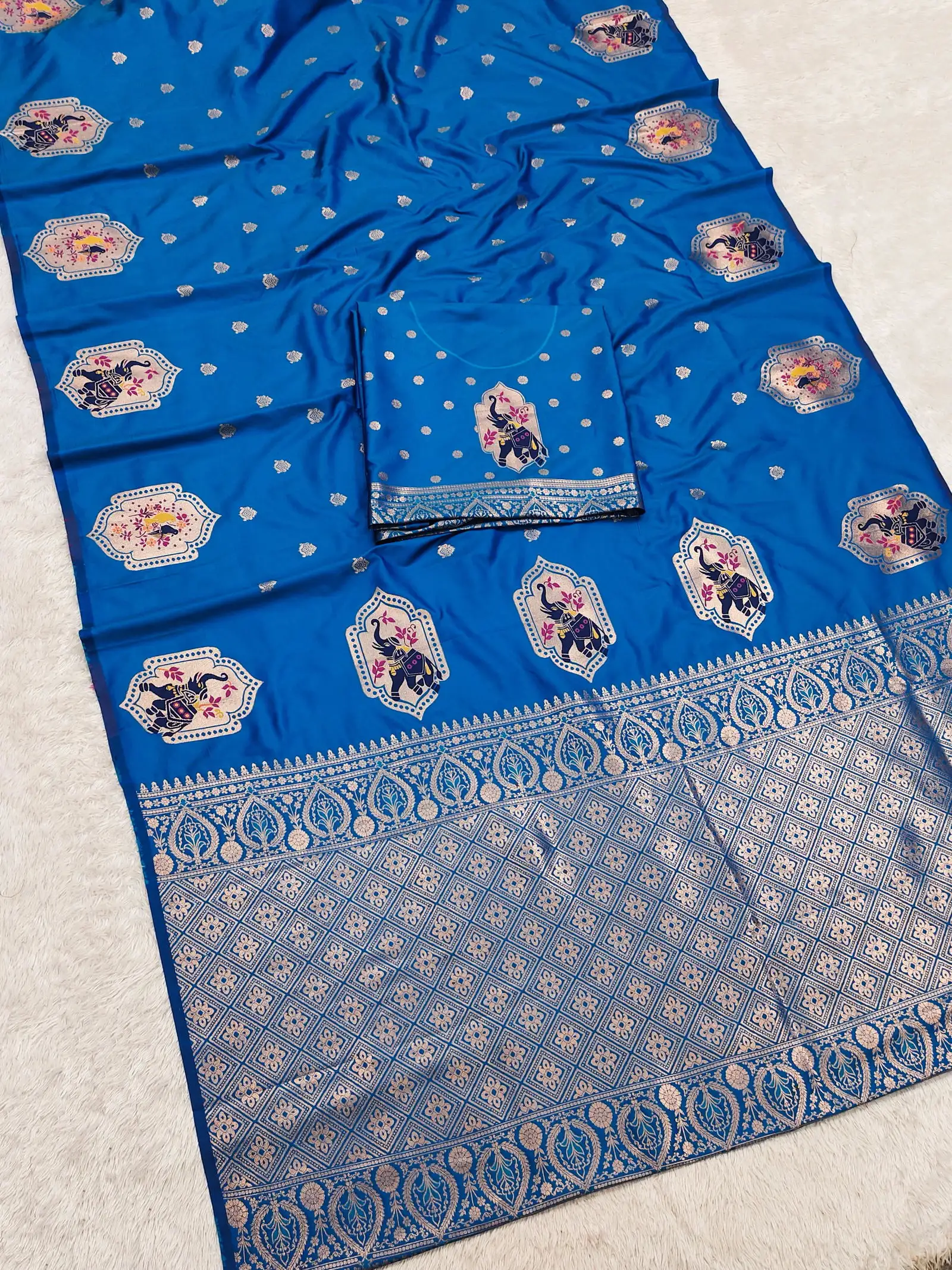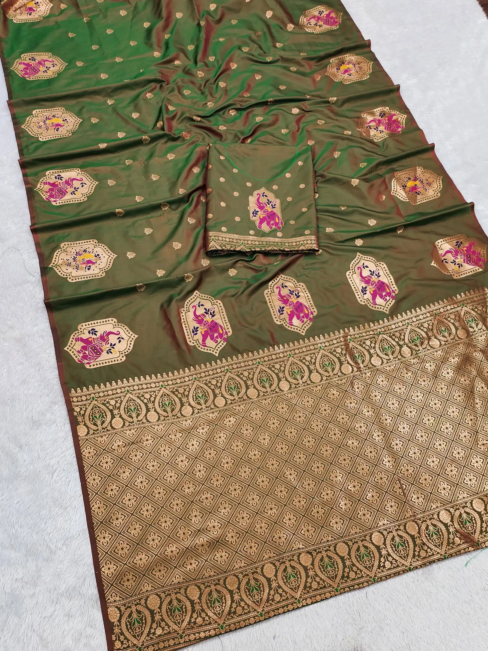 | Saree | Premium Banarasi Silk with All Over Small Zari Butta Weaving and Multicolored Meenakari Accents and Heavy Zari Woven Pallu |