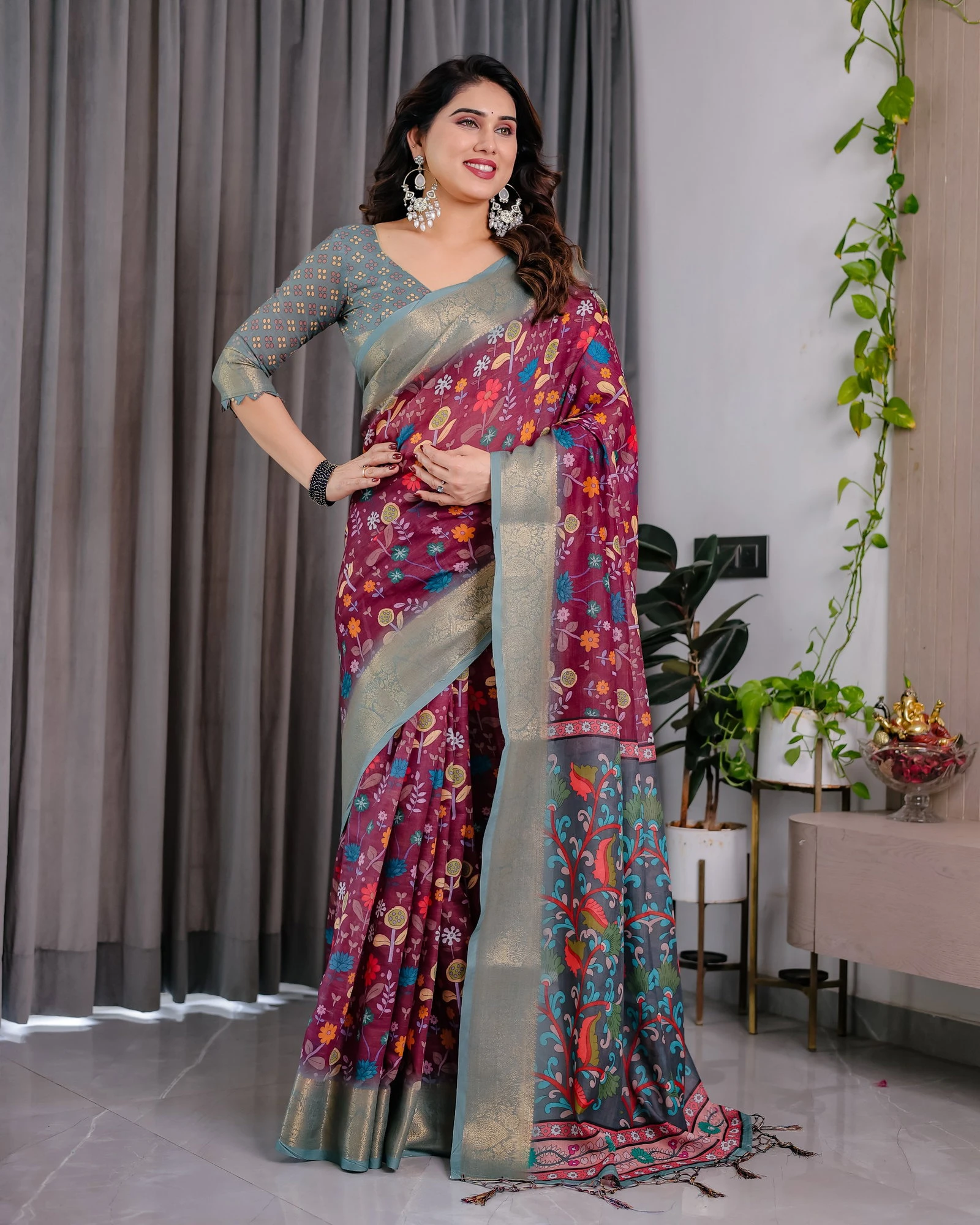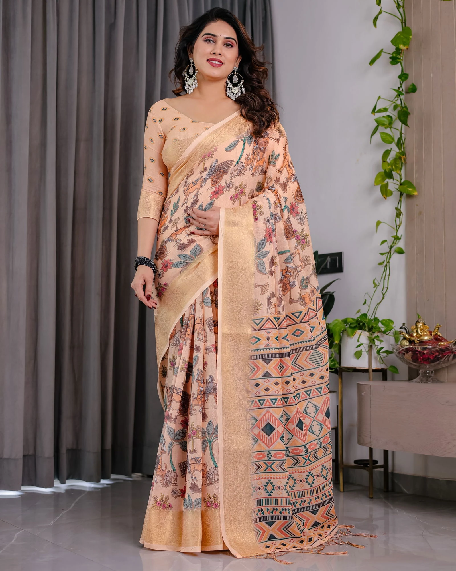 | Saree | Pure Handloom Linen with Digital Floral Print and Rich Zari Woven Borders |