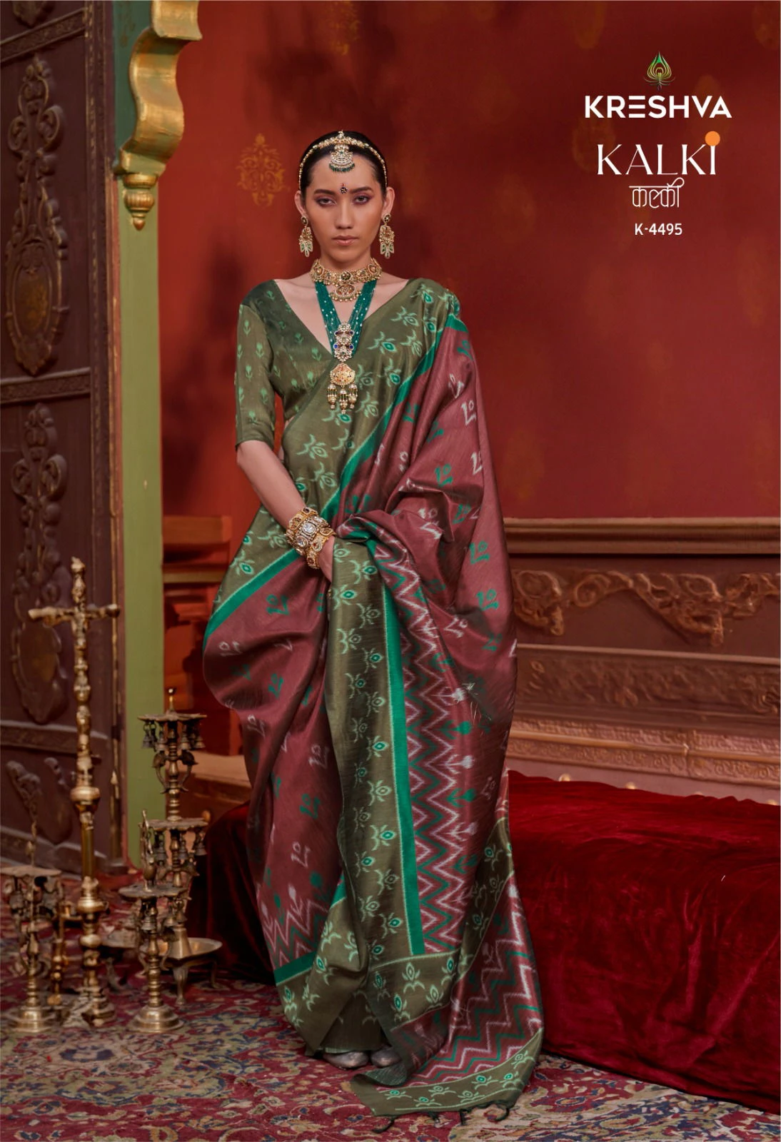 Kreshva Kalki Silk Ikkat Design with Hand Marmo Finish Saree Collection