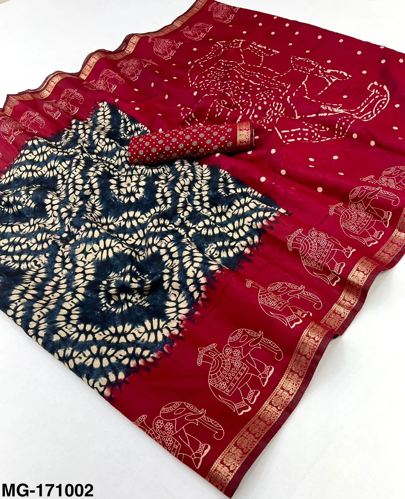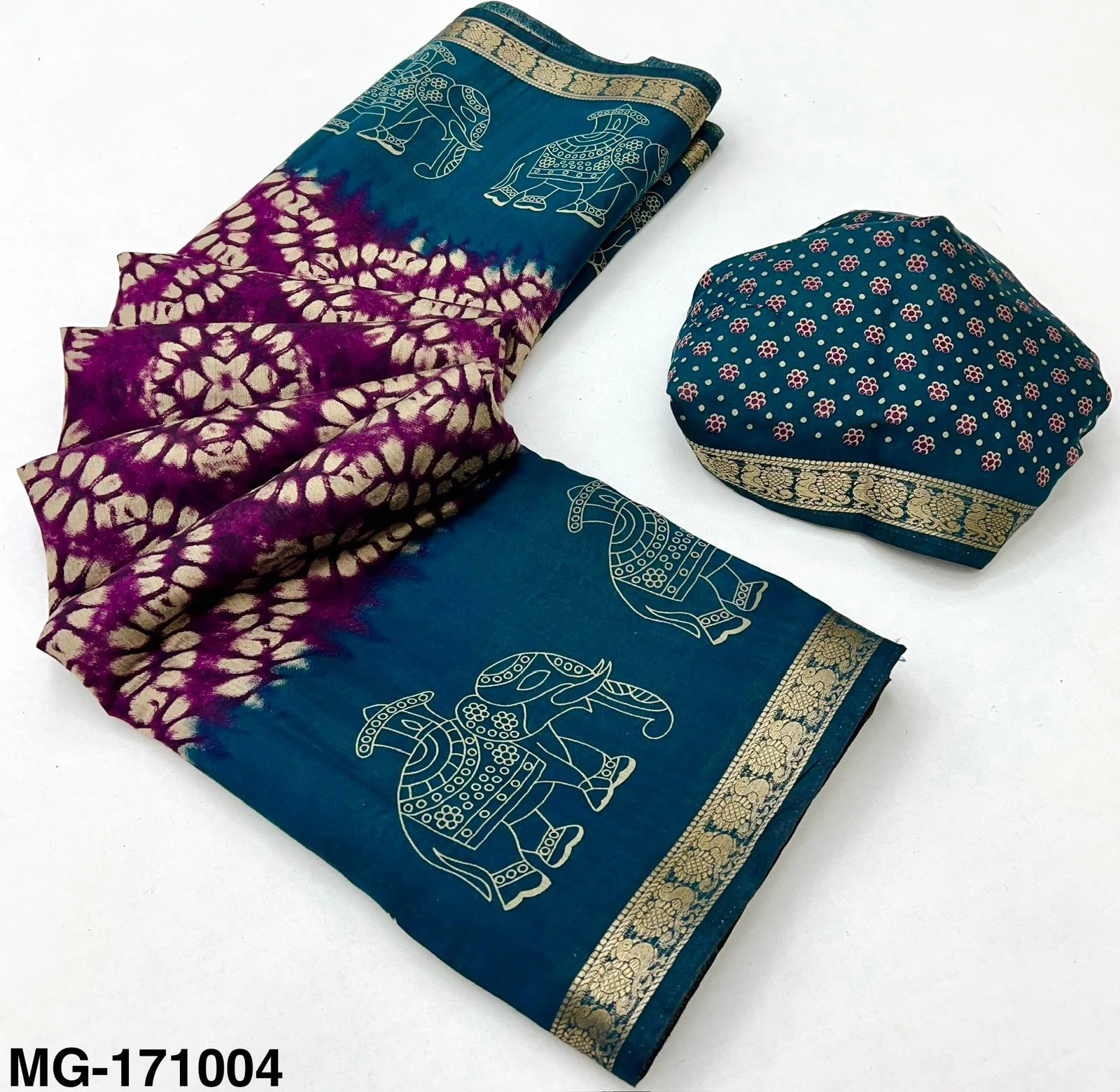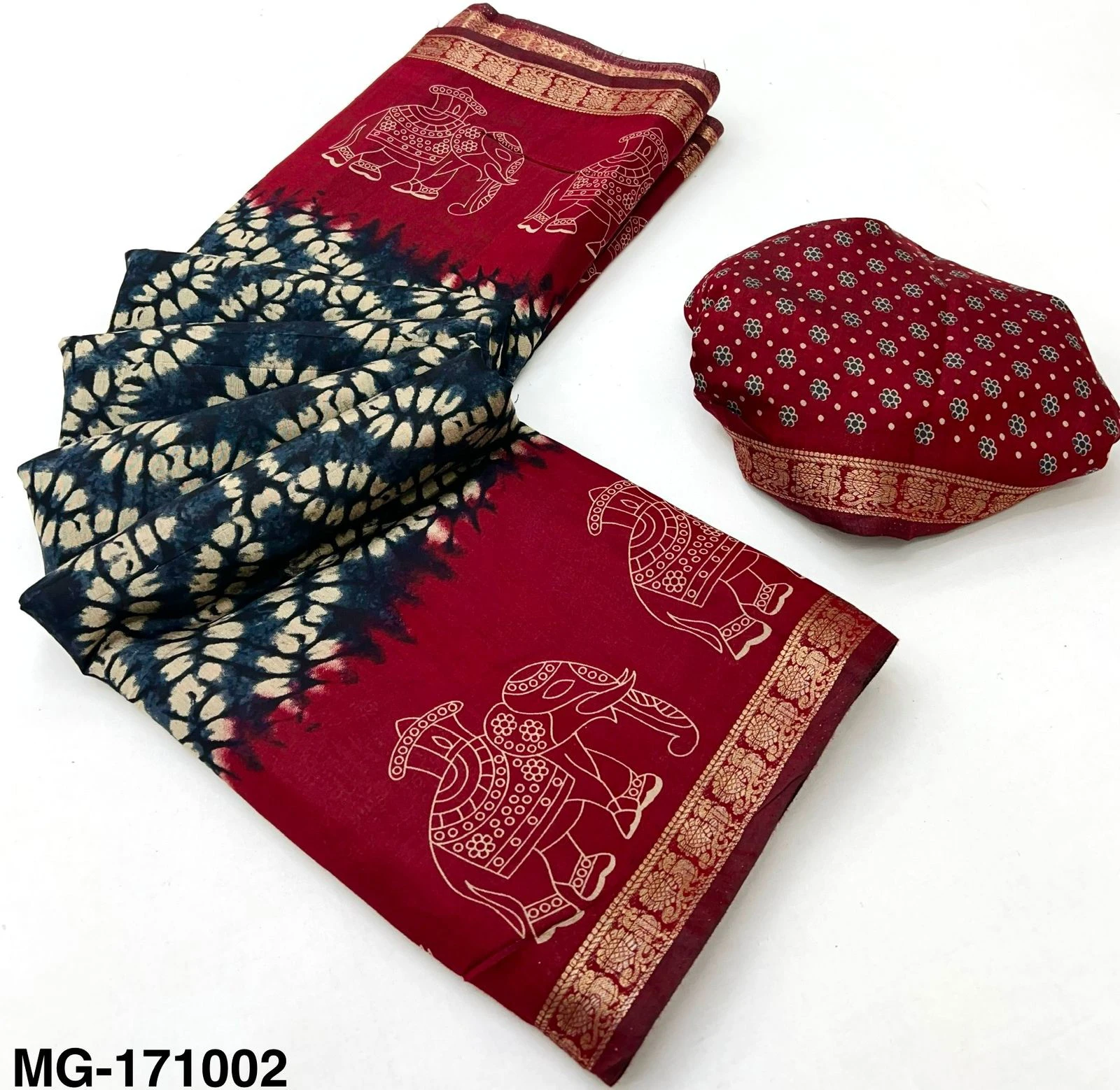 | Fabric | Mangalgiri Cotton with Shibory Print & Heavy Jacquard Zari Border with Elephant Print |