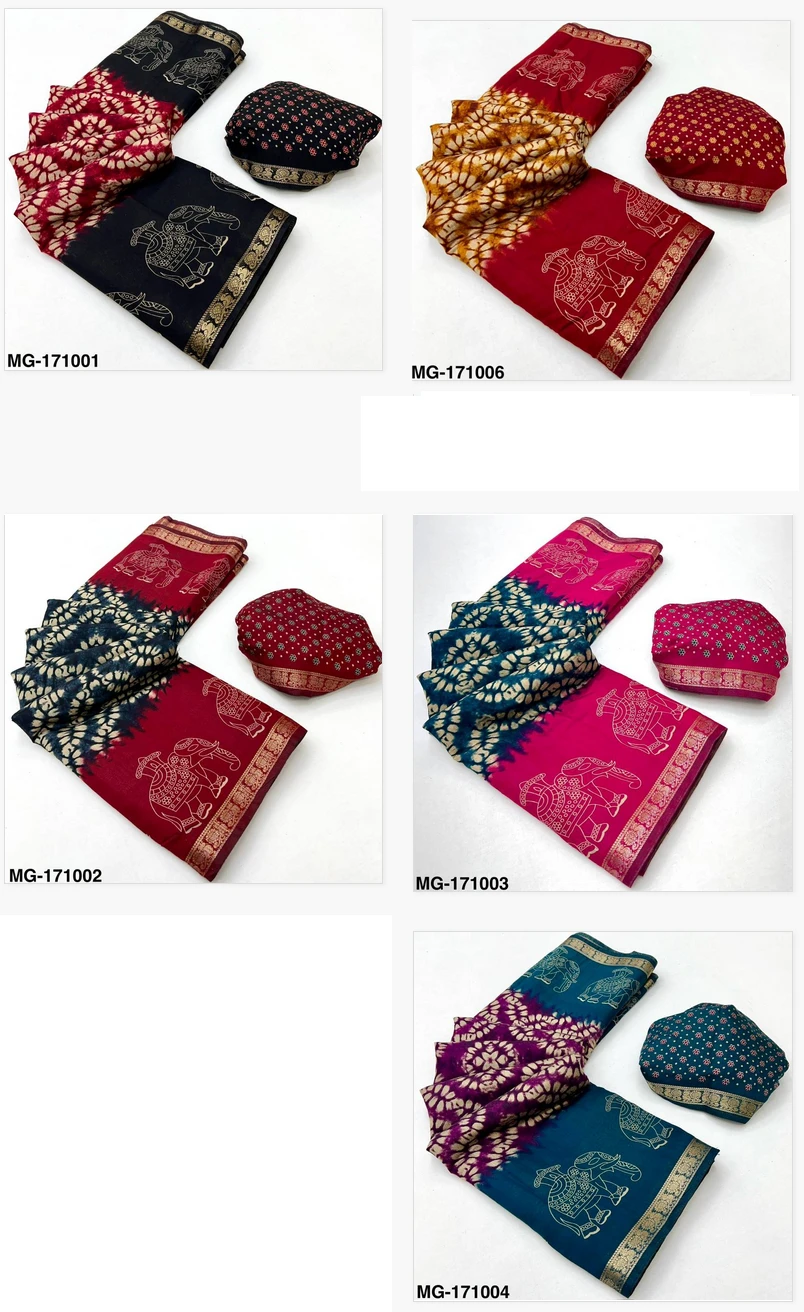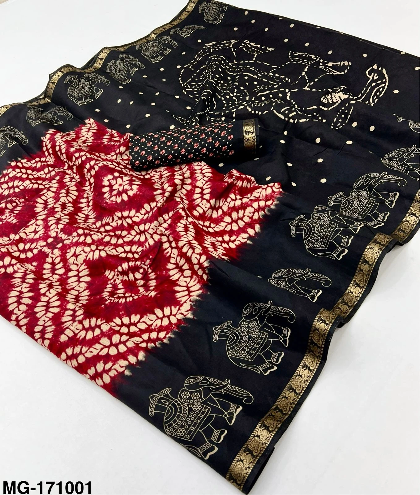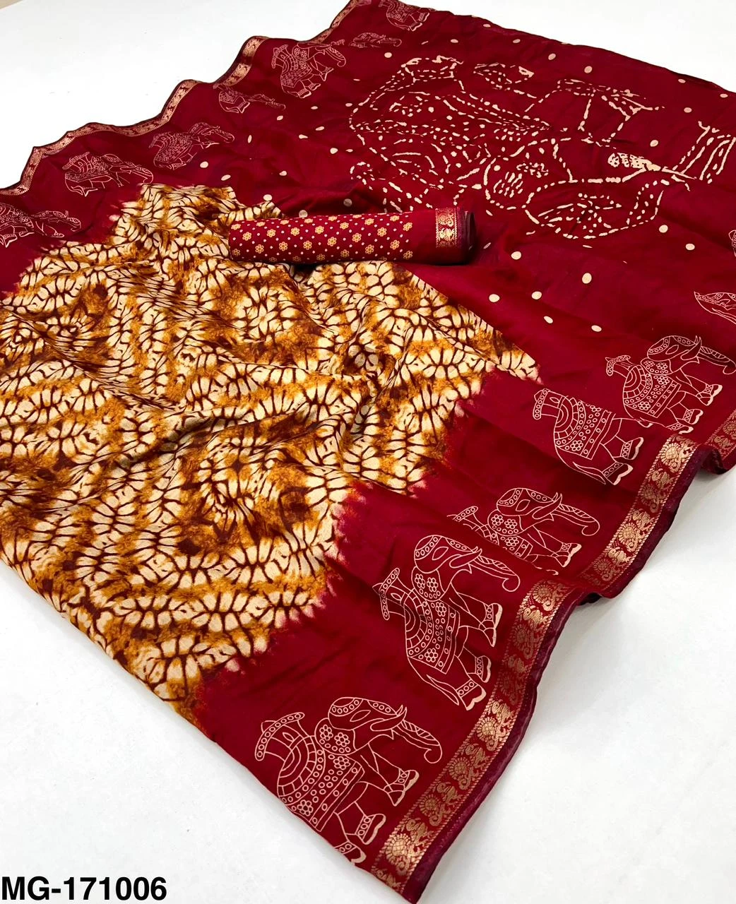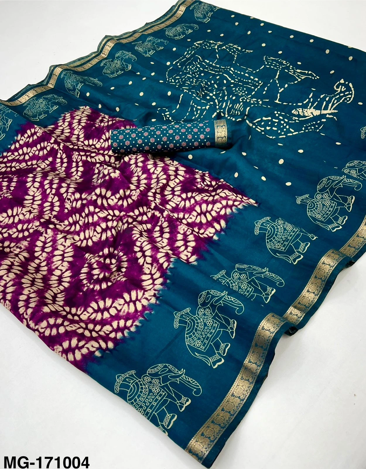 | Fabric | Mangalgiri Cotton with Shibory Print & Heavy Jacquard Zari Border with Elephant Print |
