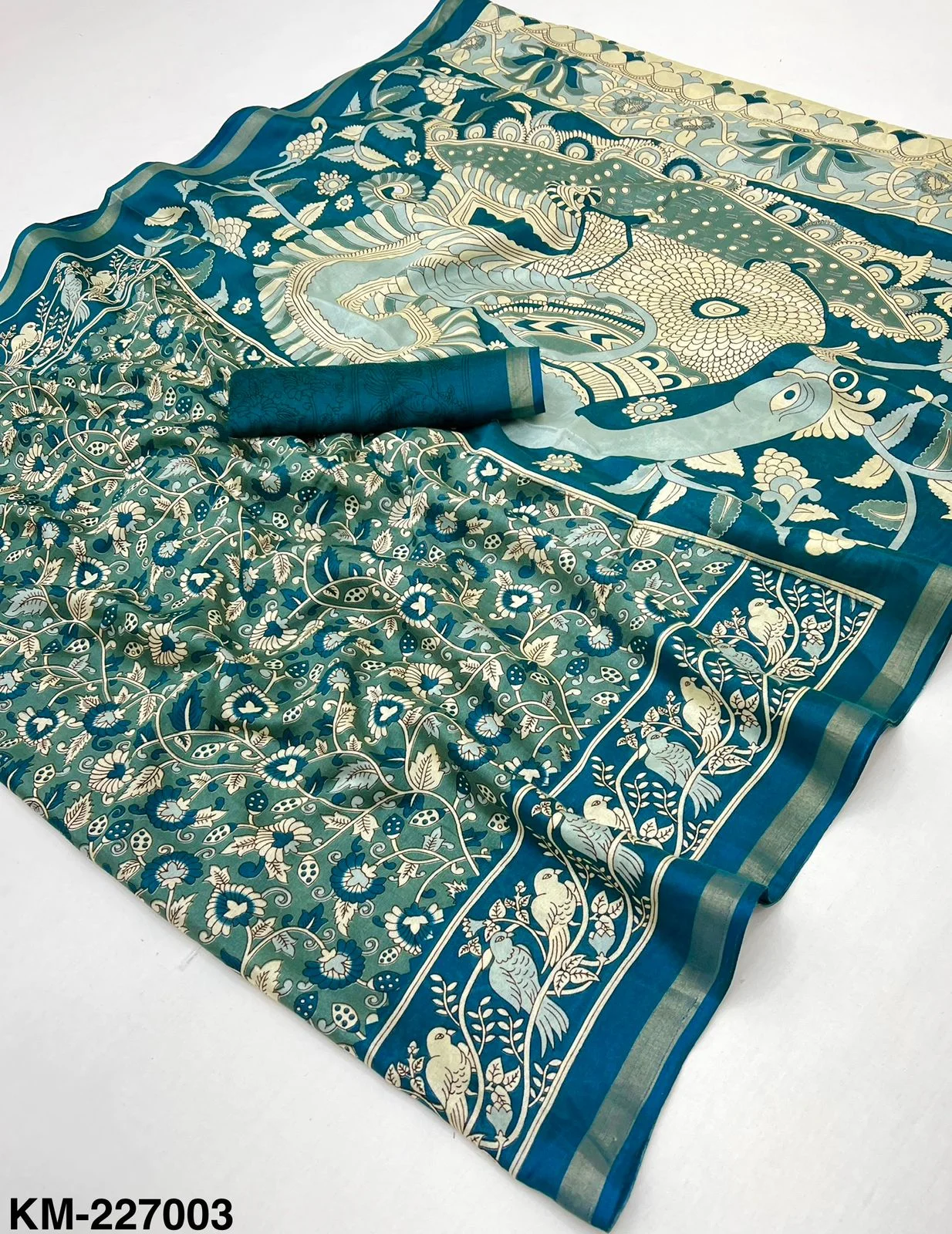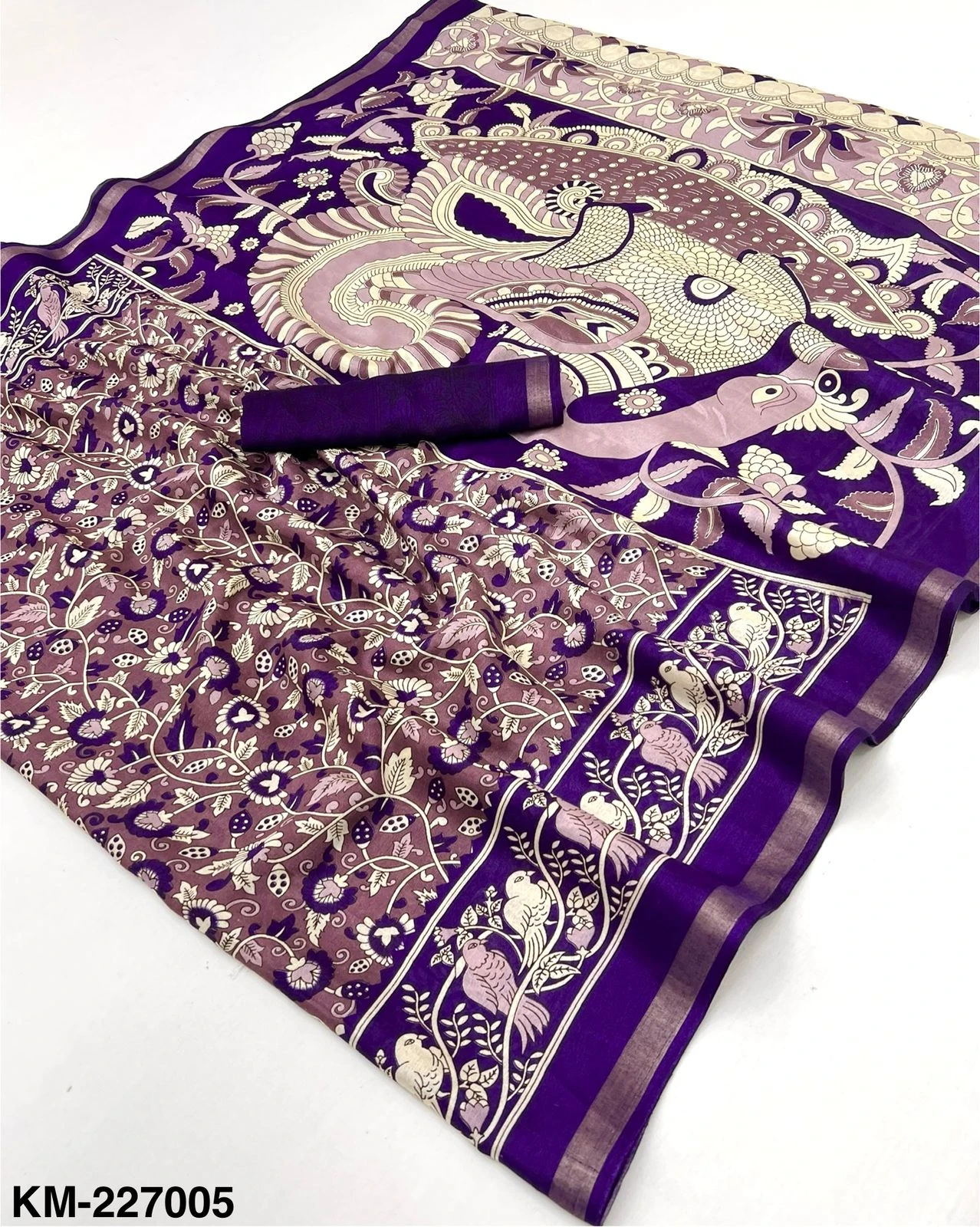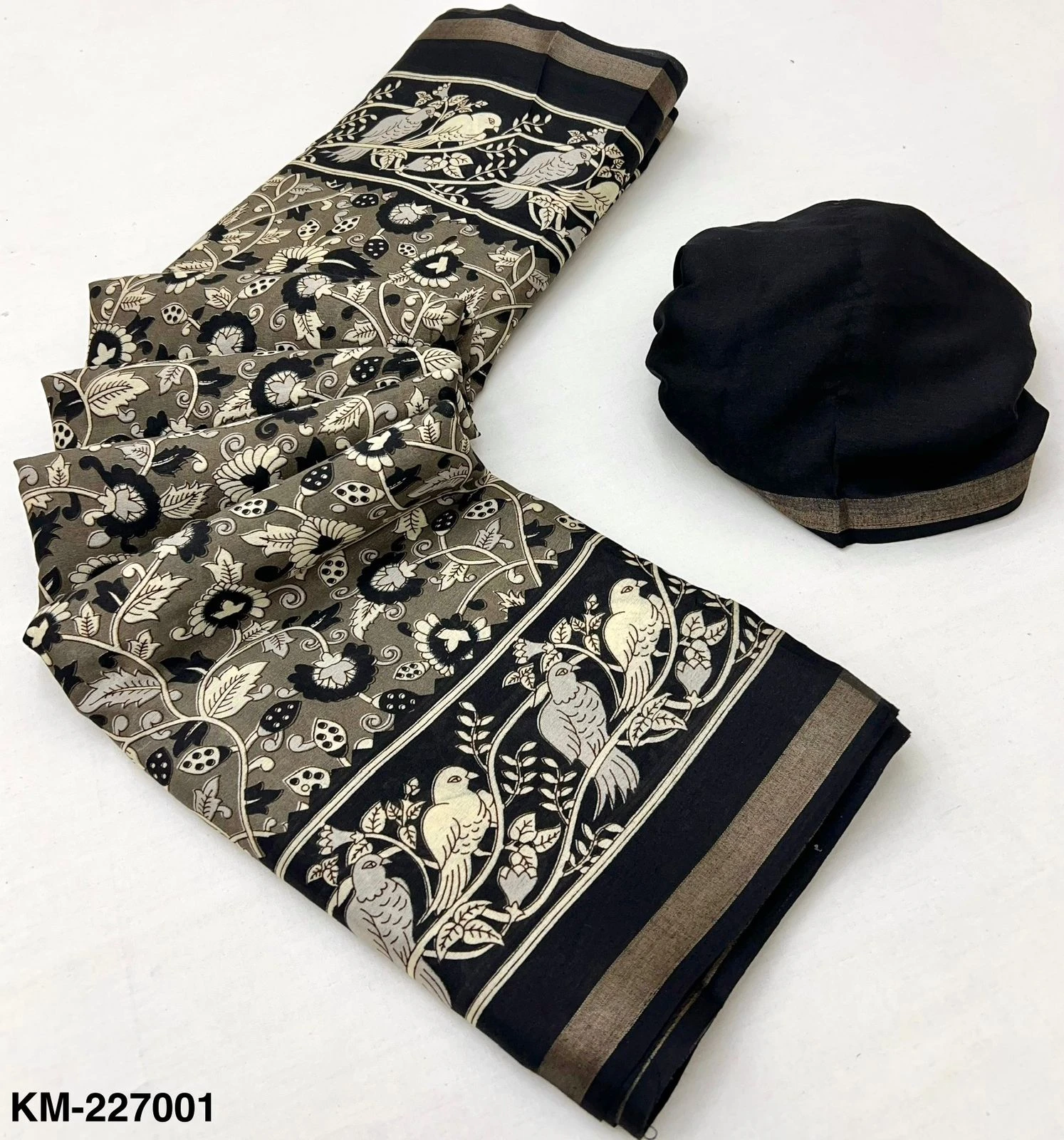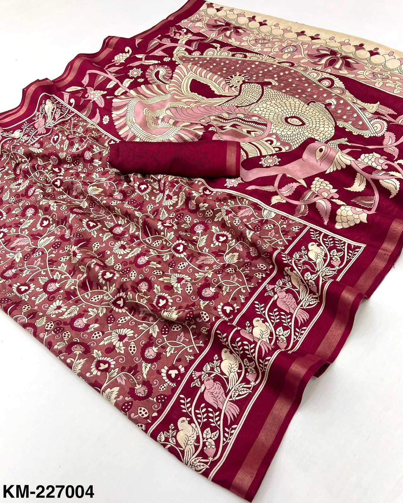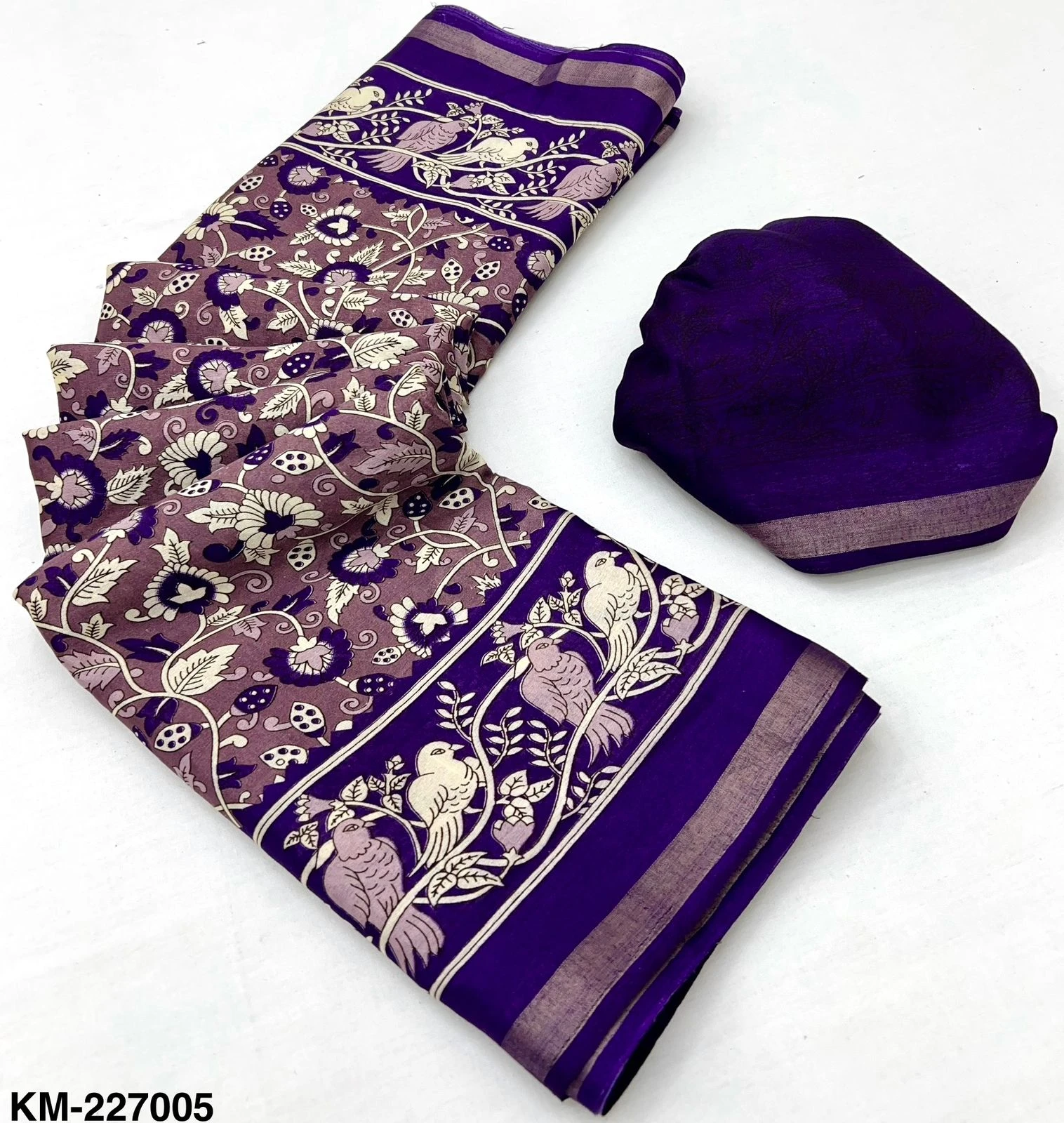 | Fabric | Soft Malmal Cotton Kalamkari Print & Zari Stripe Border |