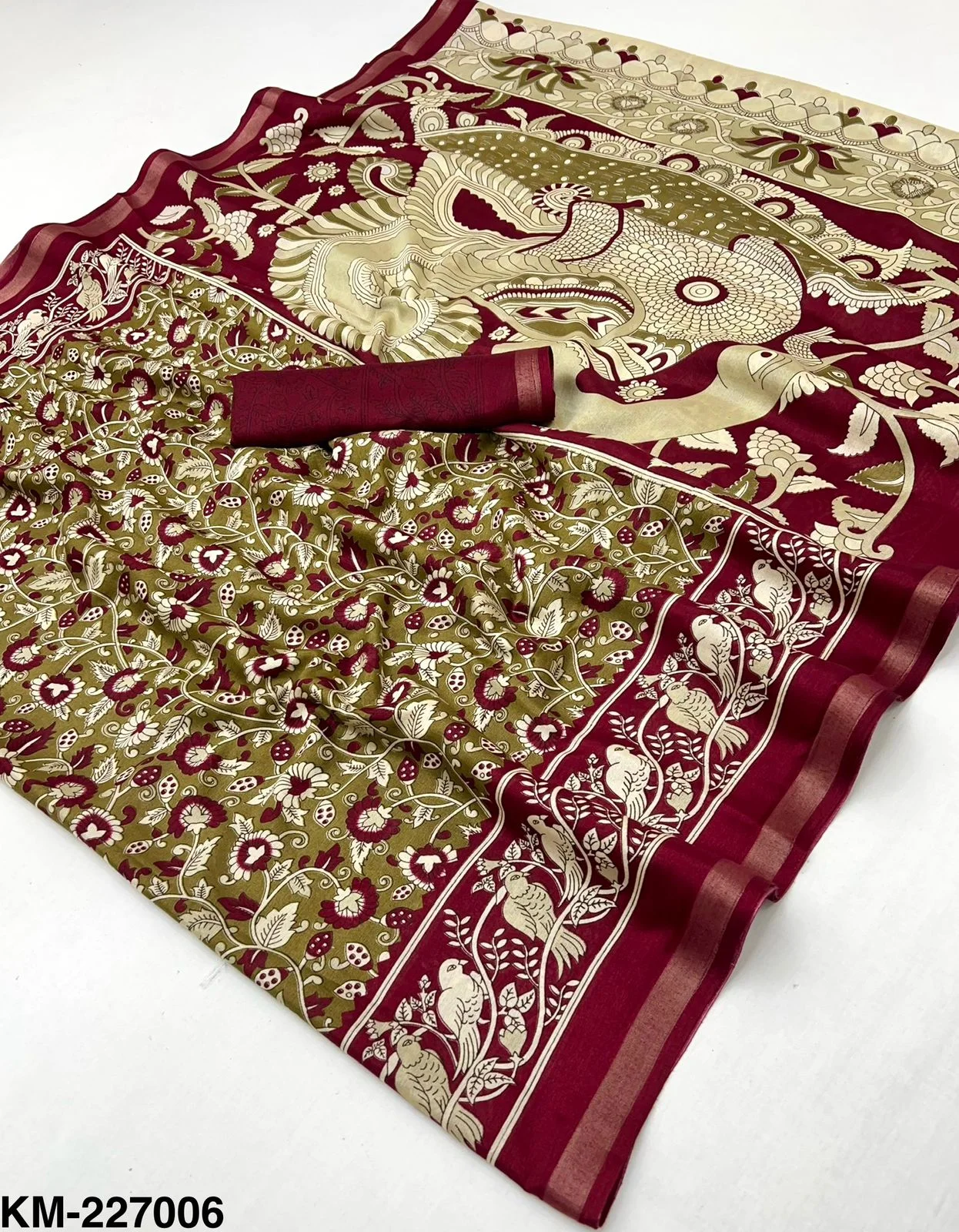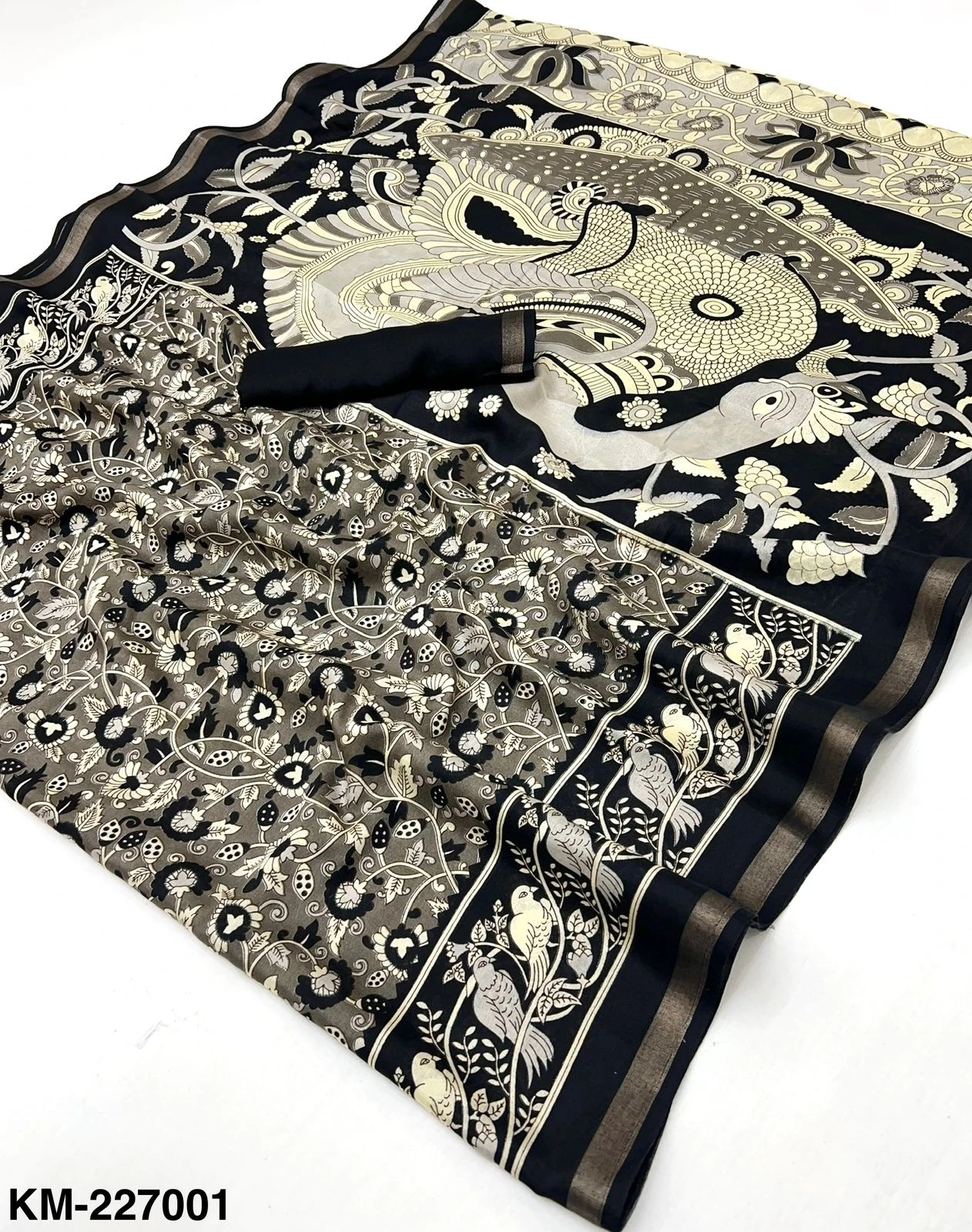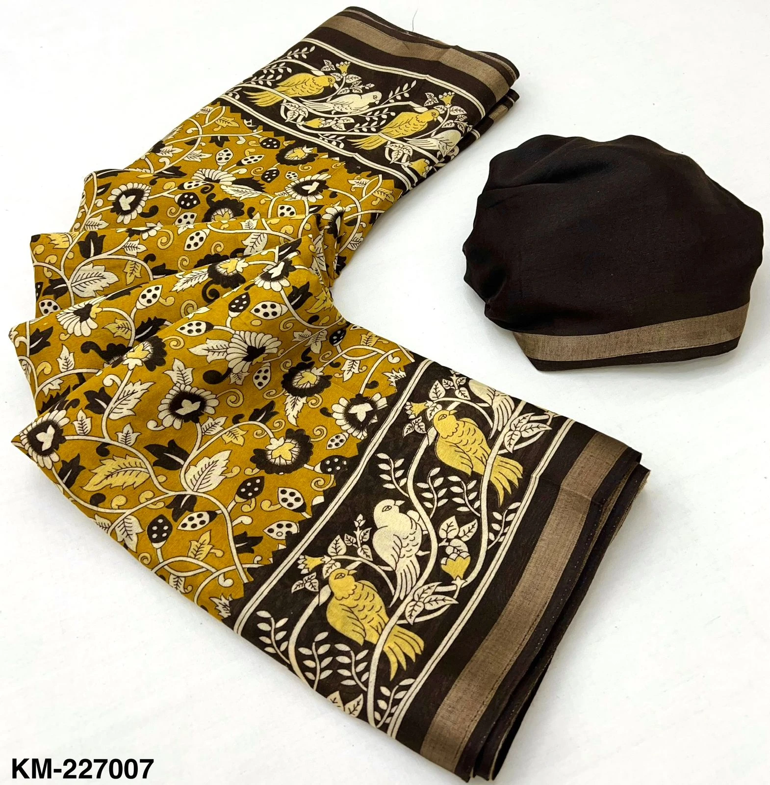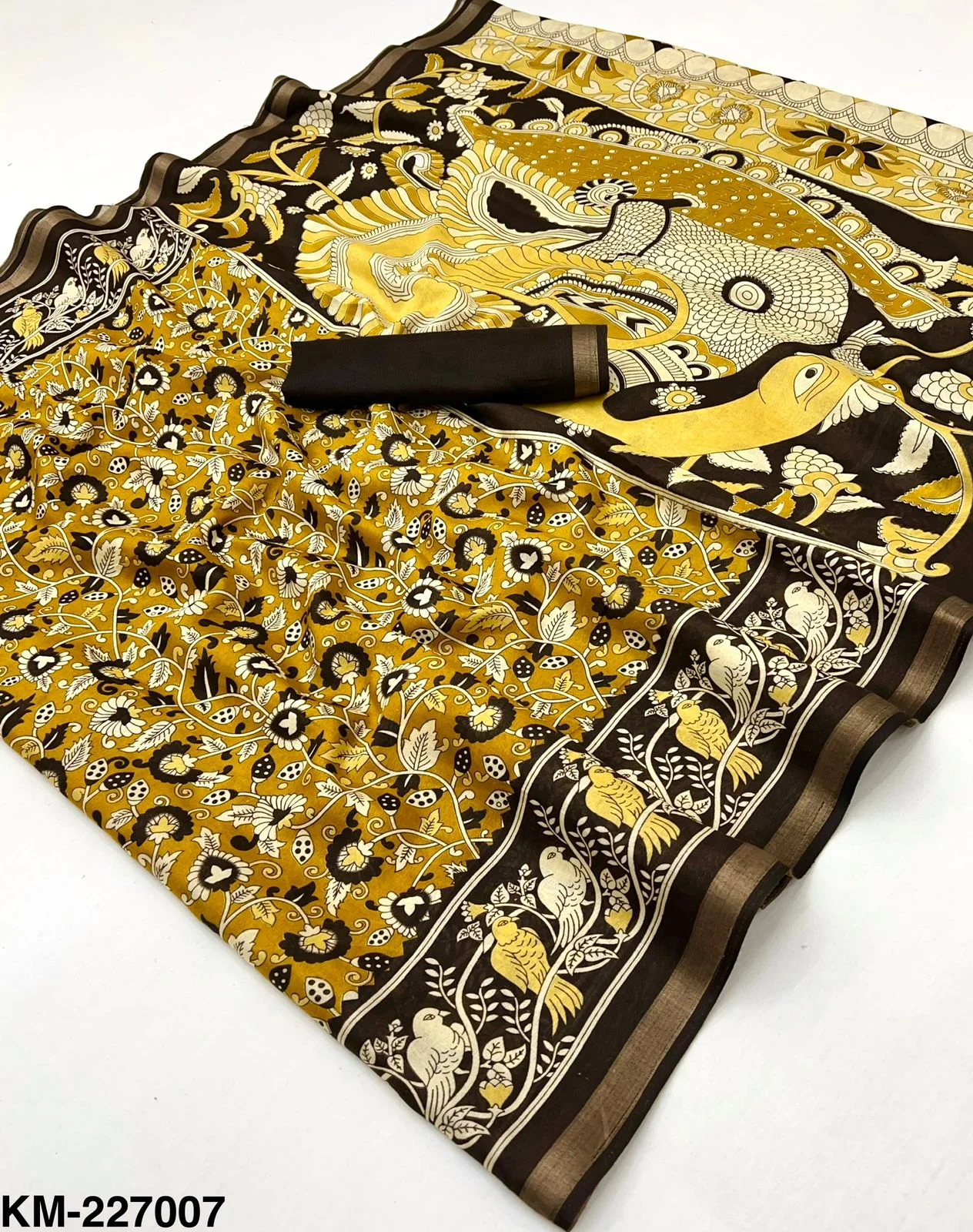 | Fabric | Soft Malmal Cotton Kalamkari Print & Zari Stripe Border |