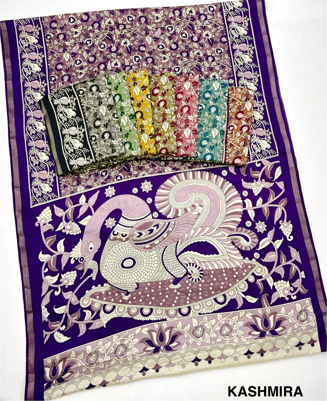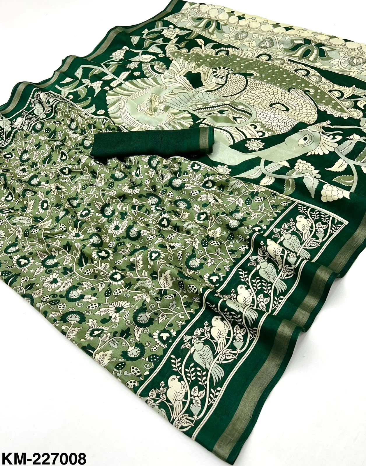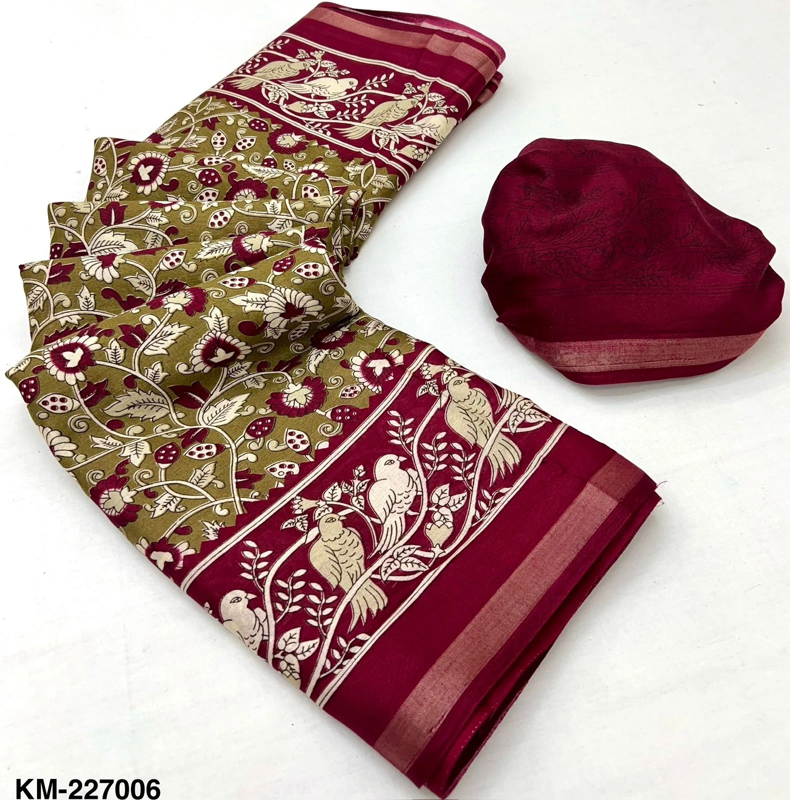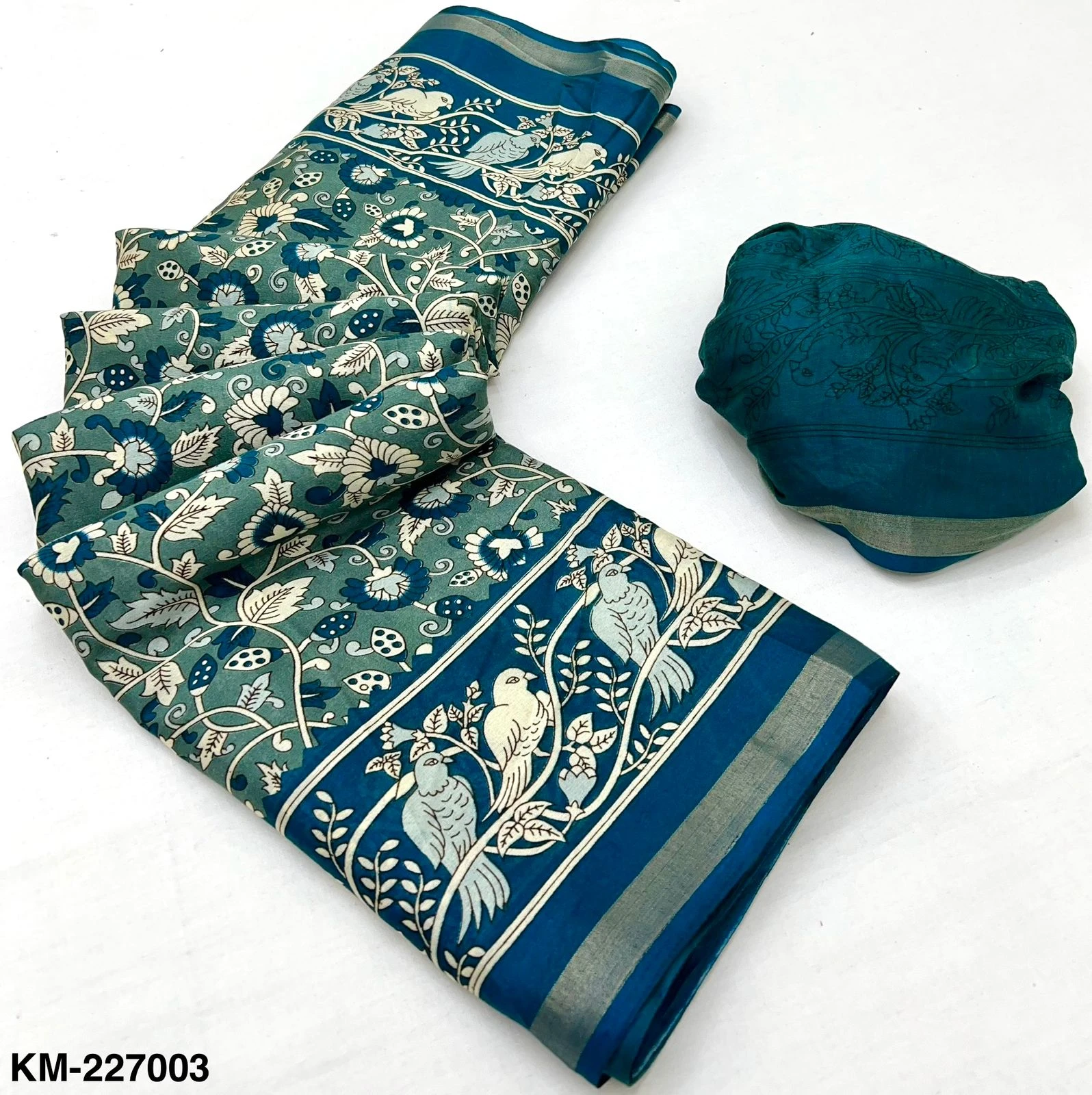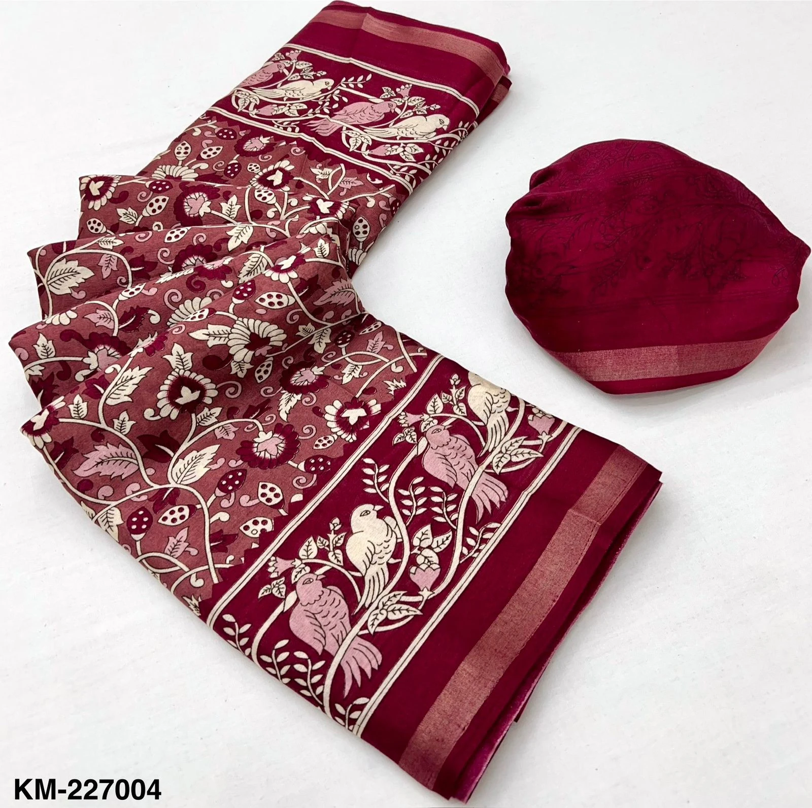 | Fabric | Soft Malmal Cotton Kalamkari Print & Zari Stripe Border |