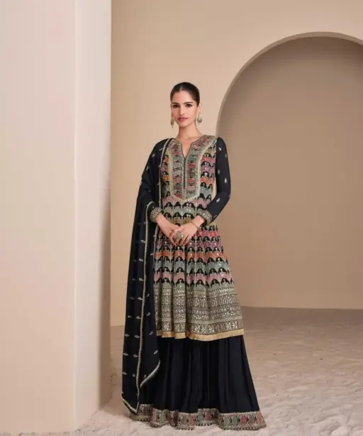 Details Real Georgette (Heavy Look Embroidered Top with Hand Seroski, Embroidered Palazzo, Embroidered Dupatta)