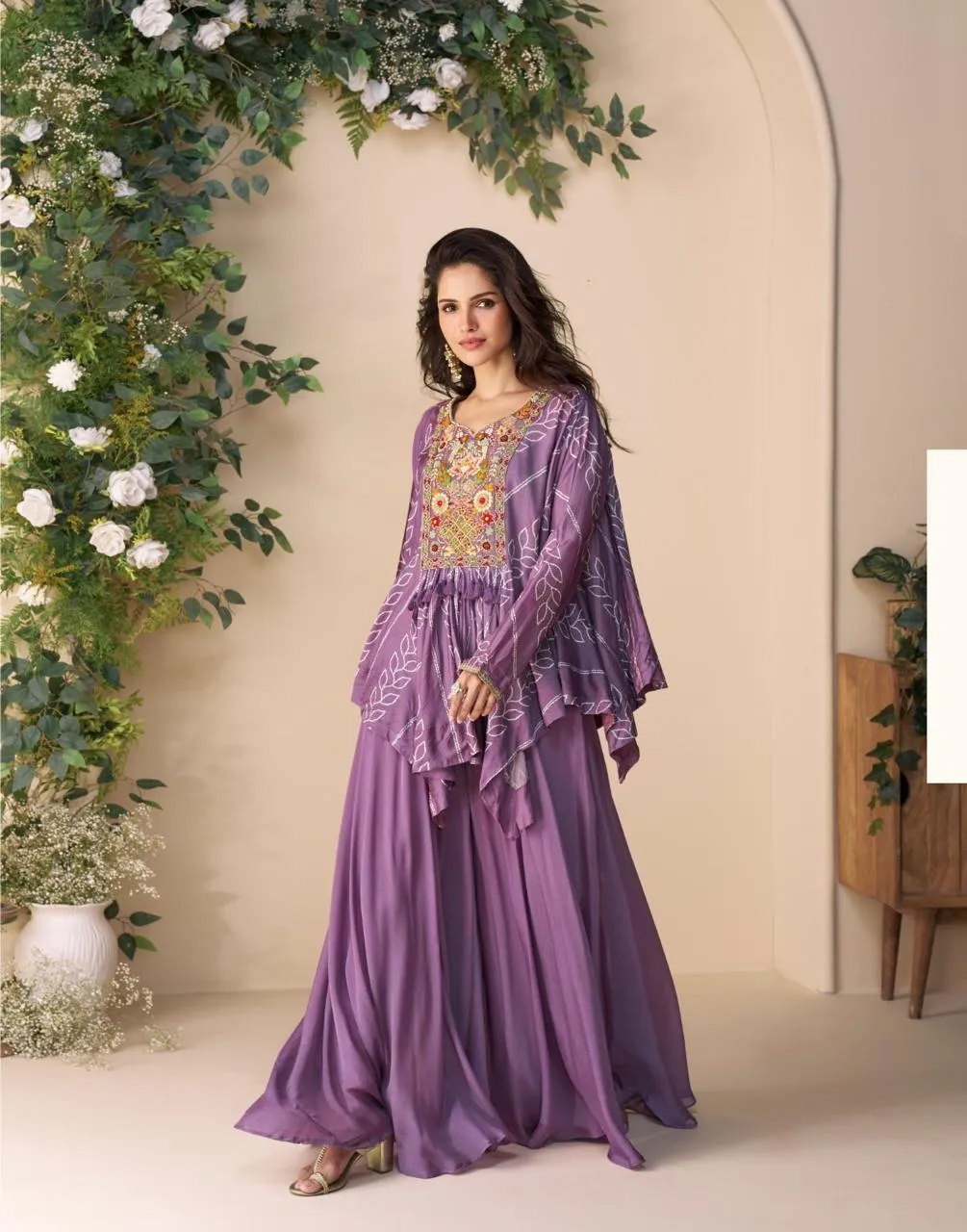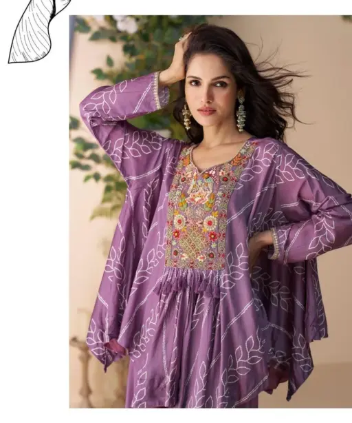 | Details | Premium Real Chinon Silk ( Embroidered Top With Hand Embellished Work Poncho Style With Plazzo ) |