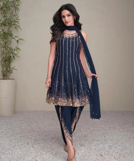 | Details | Real Premium Silk Embroidered Top with Dhoti and Embroidered Net Dupatta (Full Sleeves) |
