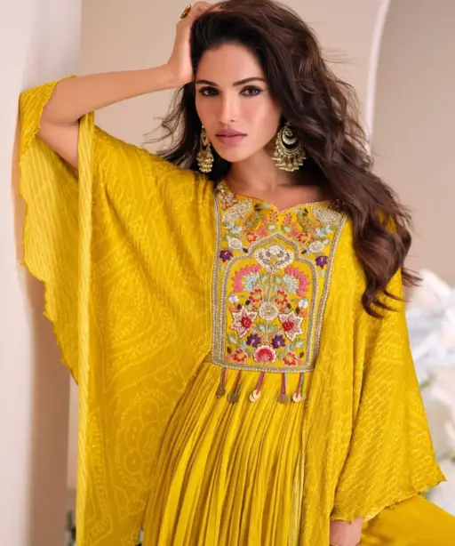 | Details | Premium Real Chinnon Silk (Full Heavy Look Hand Moti Embroidered Chinnon Silk Gown with Digital Sleeves) |