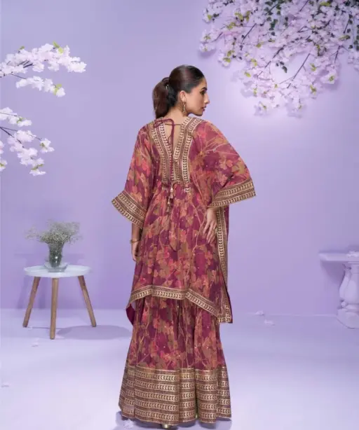 | Details | Premium Real Georgette (Latest Trendy Digital Georgette Kaftan Front And Back Fully Embroidered With Gota Touch With Gharara) |