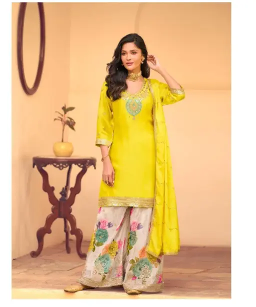 | Details | Real Premium Chinon Silk ( Festive Look Chinon Silk Embroidered Top With Embroidered Sharara And Dupatta) |