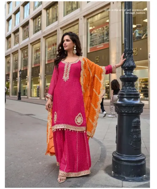 | Details | Pure Viscos Simar Jacquard Silk Full Heavy Look Viscos Simar Embroidered Top With Embroidered Plazzo Sharara And Dupatta |