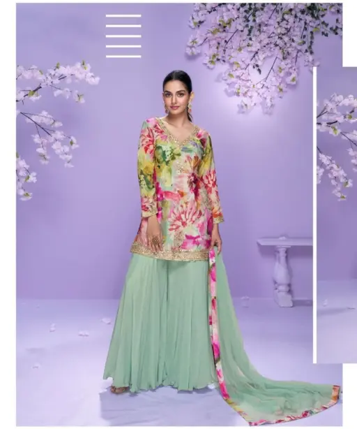 | Details | Real Premium Chinon Silk (Heavy Embroidered Top with Hand Mirror Work with Plazzo and Net Dupatta) |