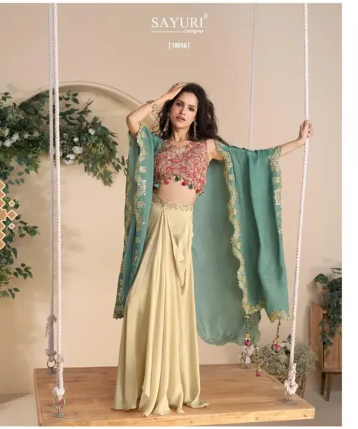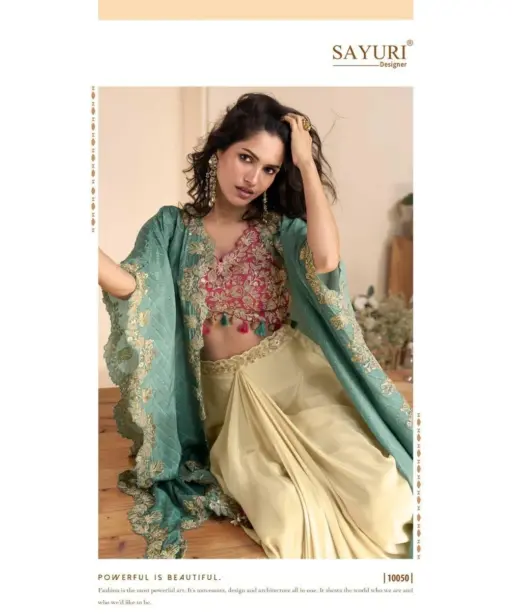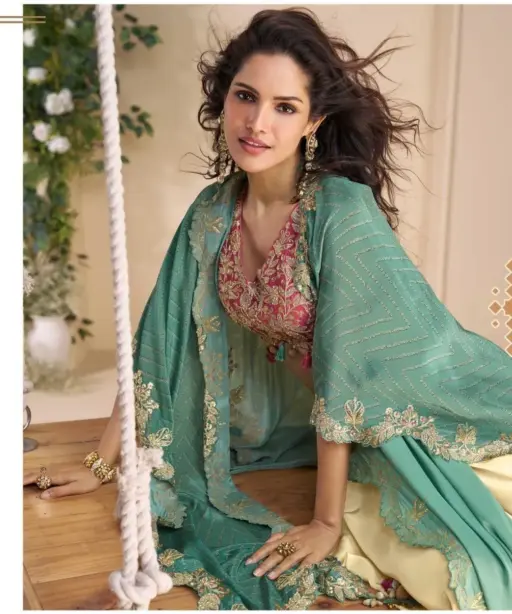 | Details | Premium Real Chinon Silk (Heavy Embroidered Shrug with Hand Embellished Work Blouse and Plazzo) |