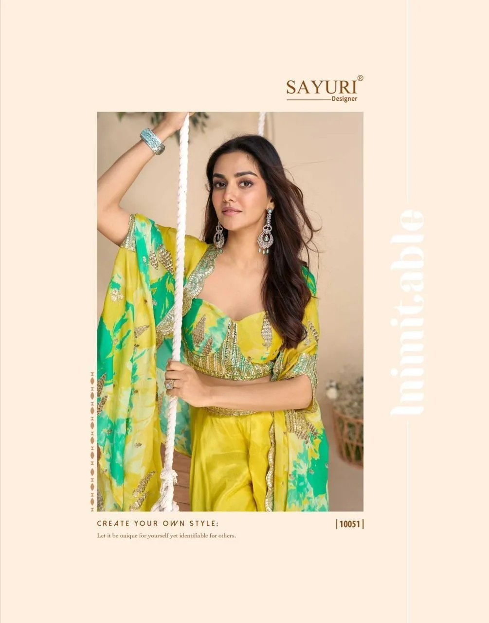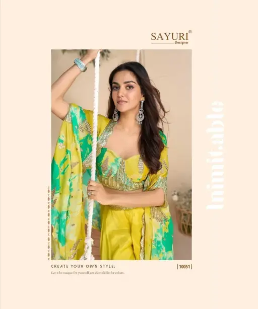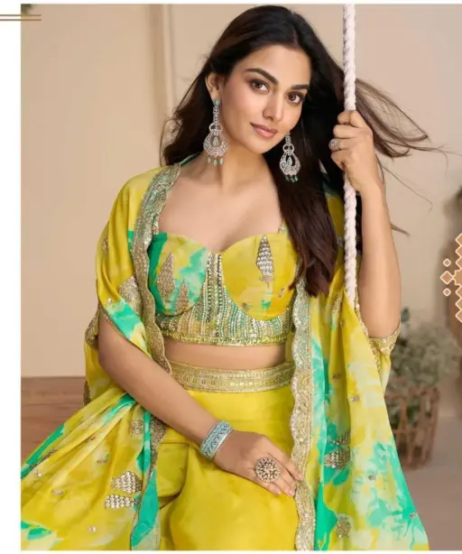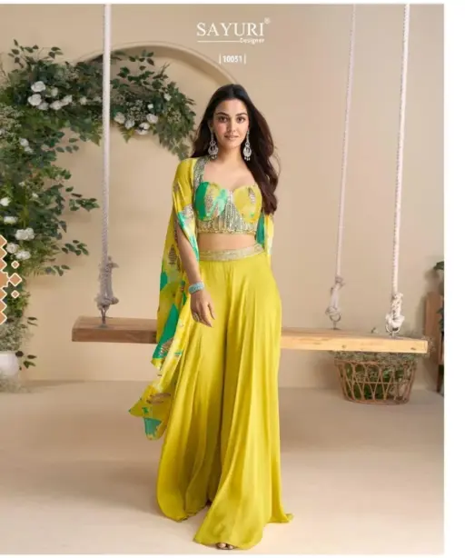 | Details | Premium Real Chinon Silk (Heavy Embroidered Shrug with Hand Embellished Work Blouse and Plazzo) |