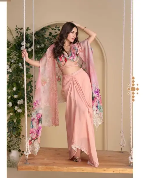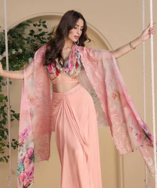 | Details | Premium Real Chinon Silk (Heavy Embroidered Shrug with Hand Embellished Work Blouse and Plazzo) |