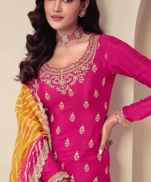 | Details | Embroidered Chinnon Top (Semi Stitch), Embroidered Chinnon Sharara Bottom (Stitched), Digital Printed Chinnon with Emb Work Dupatta |