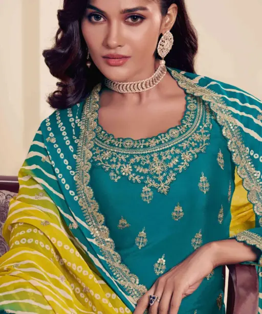 | Details | Embroidered Chinnon Top (Semi Stitch), Embroidered Chinnon Sharara Bottom (Stitched), Digital Printed Chinnon with Emb Work Dupatta |