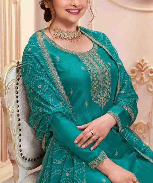 Details Embroidered Silk Georgette Top, Santoon Bottom, Embroidered Chinnon Dupatta ( Semi Stitched Product )