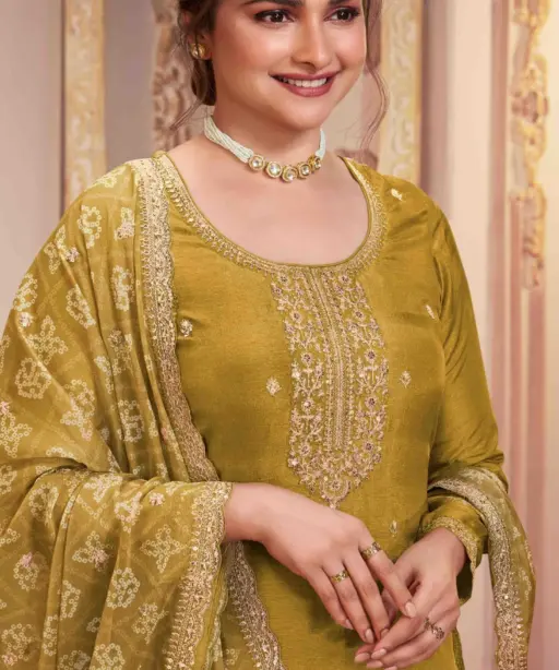 | Details | Embroidered Silk Georgette Top, Santoon Bottom, Embroidered Chinnon Dupatta ( Semi Stitched Product ) |