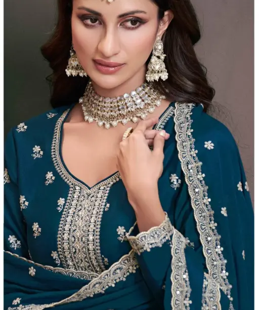 Details Designer Thread Embroidered Chinnon Top (Unstitched), Designer Thread Embroidered Sharara Bottom (Stitched), Designer Thread Embroidered Chinnon Dupatta