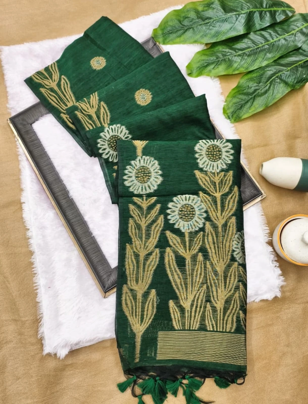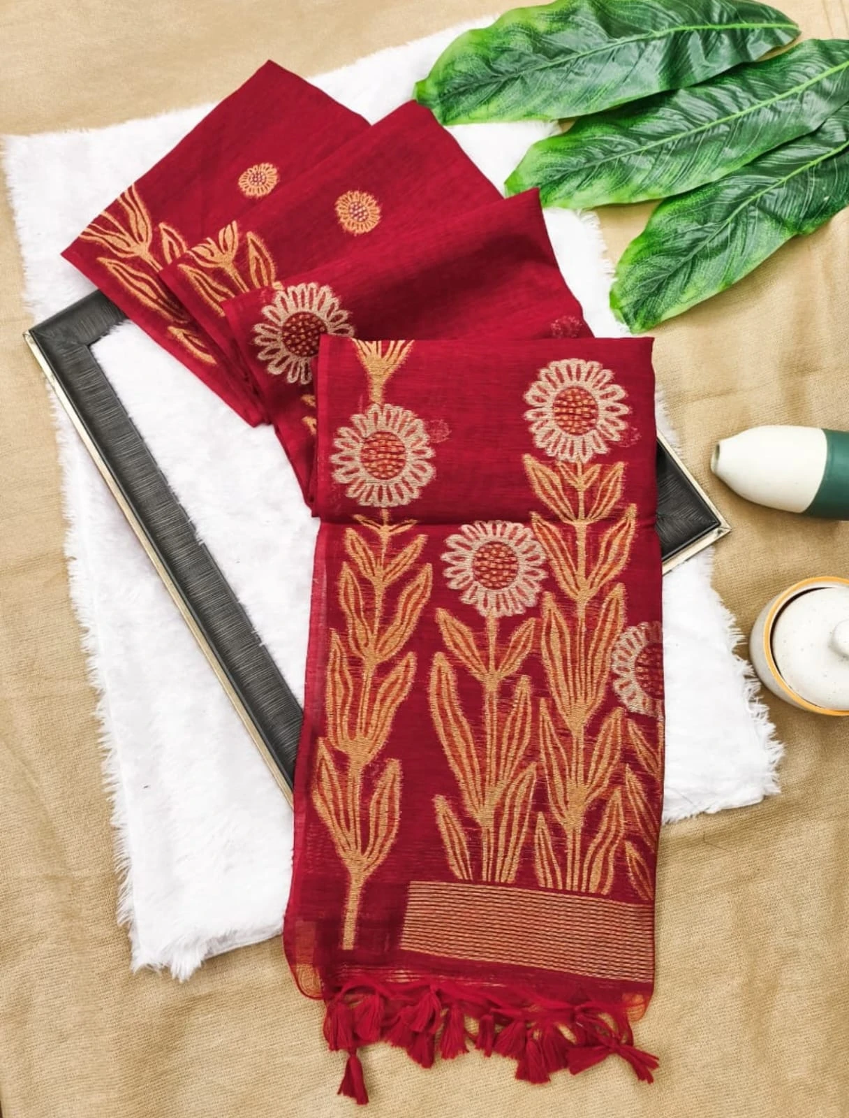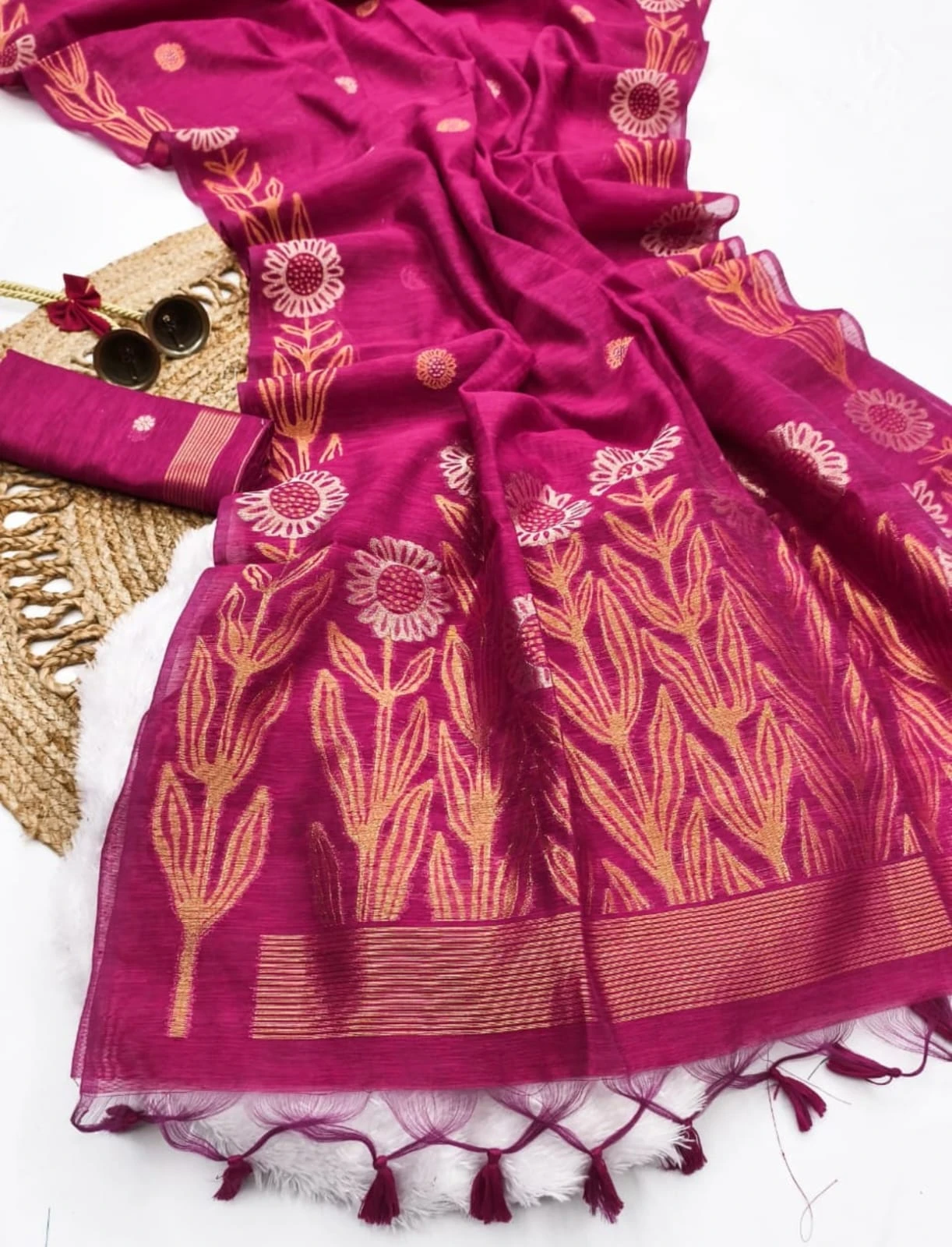 | Fabric | Soft Jute Linen Silk Saree Rich Zari Weaved Pallu |